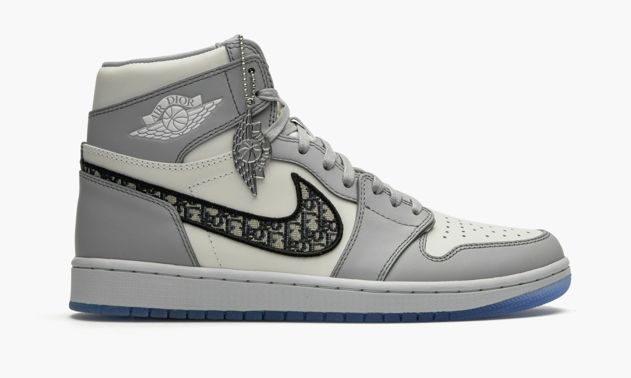 The Air Jordan 1 High Dior features a premium calf leather upper, and predominantly white and grey colourways. The Dior monogram is emblazoned on the Swoosh, a detail that stands as a signature of this collaboration. Also, there is a novel “Air Dior” Wings and a branded translucent outsole, bringing the final touch to the design.