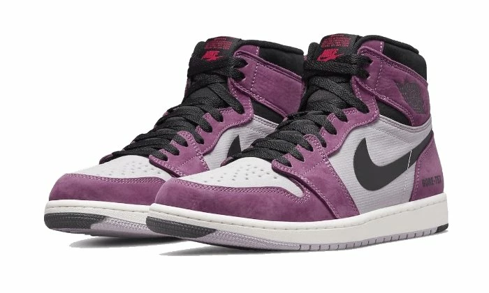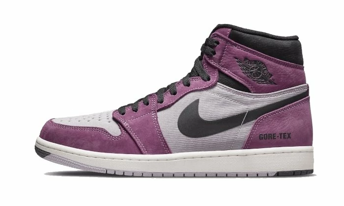 The Air Jordan 1 High Element Gore-Tex Berry features a ripstop textile/nubuck upper mauve. Several purple-colored inserts contrast with the overall look, while several black highlights on the laces, Swoosh and collar darken the silhouette.