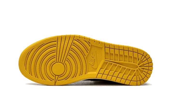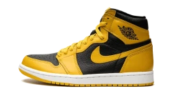 The Air Jordan 1 High OG Pollen features a black upper with yellow overlays to give it its name, while a white midsole provides contrast. Nike Air branding on the tongue and the iconic Wings logo at the ankle complete the design.