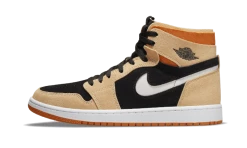 The Air Jordan 1 High Zoom Air CMFT Pumpkin Spice features a beige and black suede overlay with an orange textile collar. The white cut-out Swoosh and wings logo adorn the side of the pair. And a red outsole completes the look!