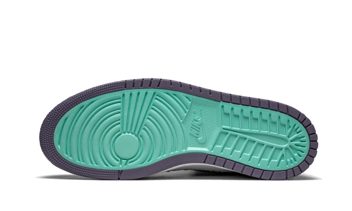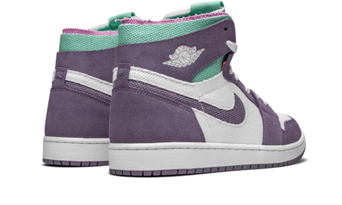 The Air Jordan 1 High Zoom Air CMFT Tropical Twist features a suede and canvas upper. A white base with purple accents on the leather overlays, Swoosh and tongue create the perfect color balance. Water green on the ankle brings it all together.