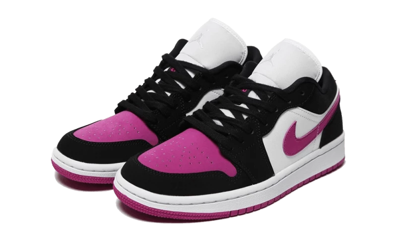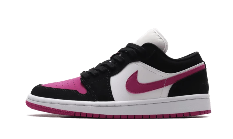 The Air Jordan 1 Low Black Cactus Flower features a fuchsia pink toebox that matches the Swoosh and outsole. The white leather base is contrasted by the black suede overlays, enhancing the comfortable feel of the iteration. The pair is completed with a tonal embroidered Jordan logo on the white tongue.