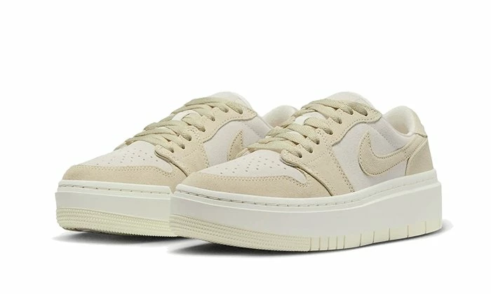 The Air Jordan 1 Low Elevate Tan Suede features an off-white suede base with beige suede inserts. A touch of originality to this pair, the rubber wedge sole picks up the shade of the upper, namely an off-white midsole and a beige outsole.