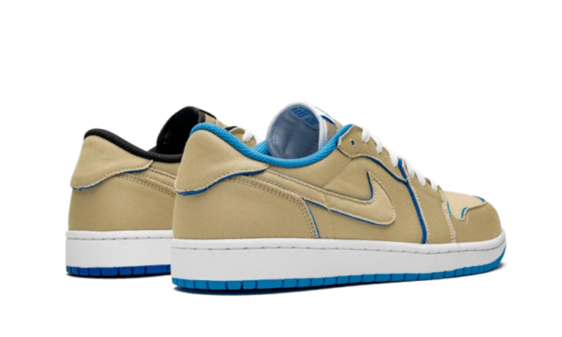 The Nike SB Air Jordan 1 Low “Desert Ore” comes in an asymmetrical colourway with two different pairs. Both feature a brown leather upper but the right pair is contrasted with UNC blue accents while the left foot features royal blue and black aspects. These colour contrasts are present on the linings, tongues, swoosh and outsoles.