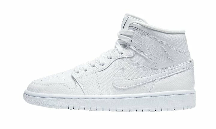 The Air Jordan 1 Mid White Snakeskin features a novel upper finish with a snakeskin effect thanks to the textured leather. White laces, a Wings logo and a tonal Swoosh match the monochrome silhouette. The usual Jordan branding on the tongue is noticeable, here presented in black with a Jumpman standing out from the rest. Finally, matching laces and a matching sole finish off the look.