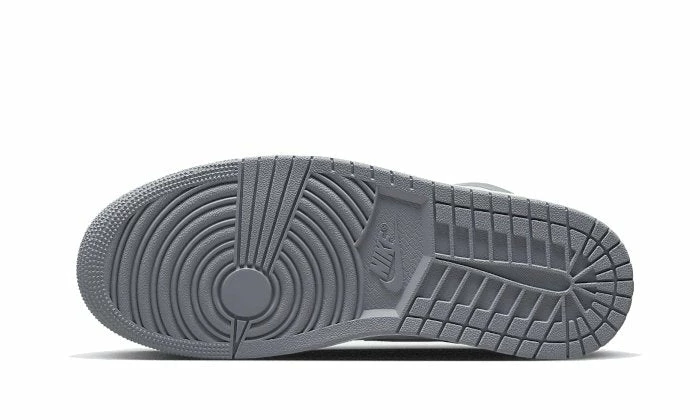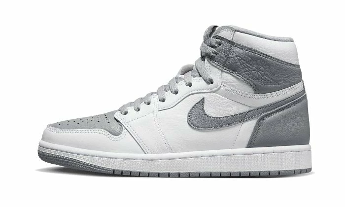 The Air Jordan 1 Retro High OG Stealth features an upper designed from a mix of leathers. There is a white crackled leather base, matched with the grey flaps, while a grained leather is used on the toebox and heel reinforcement. A few touches of smooth white leather are also visible, especially at the eyelets. To conclude the whole, a tone-on-tone sole brings its stone to the building.