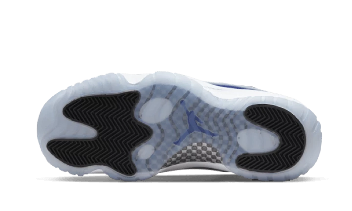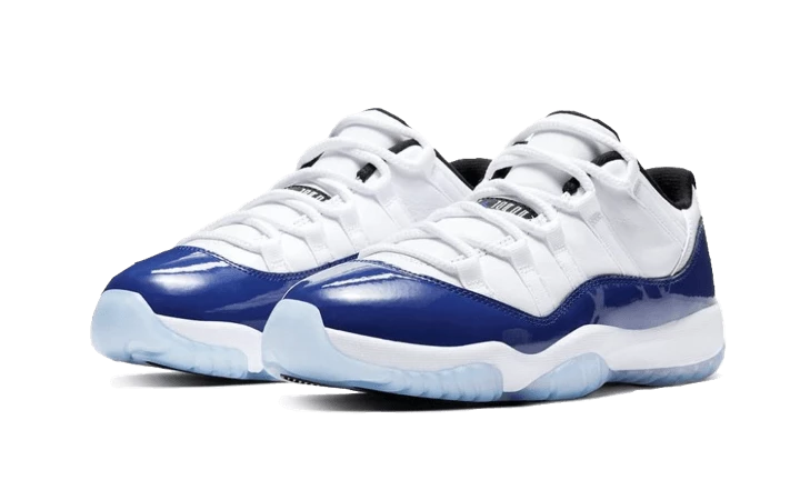 The Air Jordan 11 Retro Low Concord Sketch follows the look of the Air Jordan 11 OG Concord, this time with a blue patent leather upper. It features a white synthetic base, a white midsole and a black inner lining. The outsole is presented in an Icy finish, matched to the blue front part The design is refined by the usual branding elements with a black Jumpman at the heel and a label indicating “Jumpman Jordan” accompanied by a mini Jumpman.