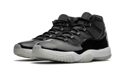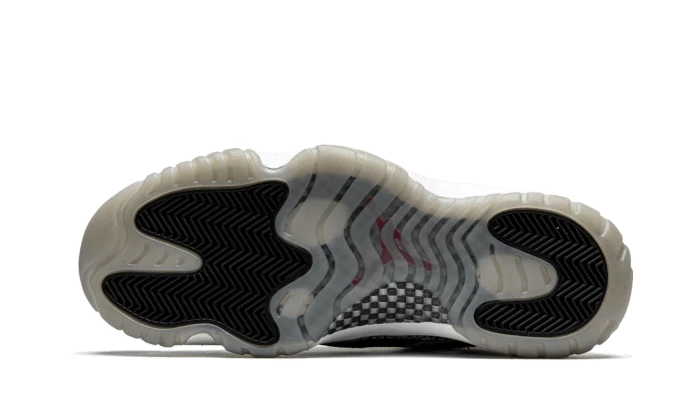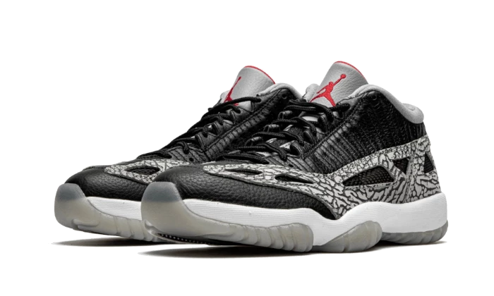 The Air Jordan 11 Retro Low IE Black Cement has a black leather base, enhanced by Elephant Print inserts, surrounding the entire vamp from heel to toebox. At textured effect near the eyelets gives relief while the grey tongue and red Jumpman add a touch of colour. Finally, a white midsole and a light grey outsole complete the look.