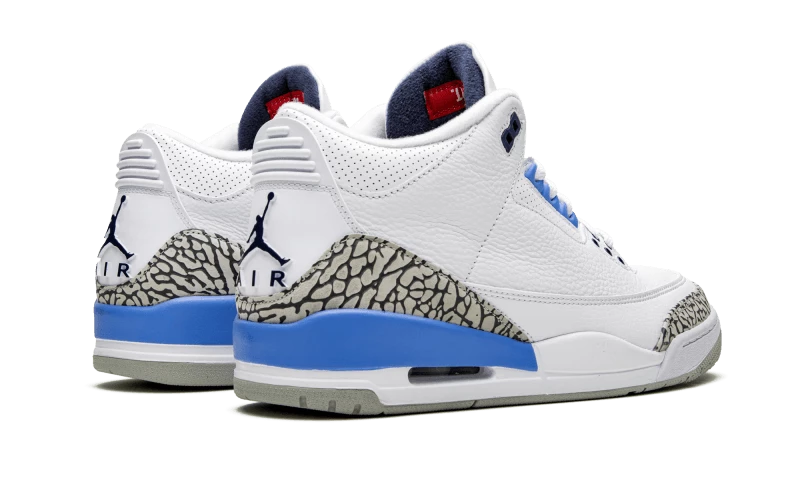 The Air Jordan 3 UNC features a white leather upper combined with elephant print inserts, which are common to the Air Jordan 3. There are blue accents on the heel, eyelets and sole. The pair is finished with a grey outsole.