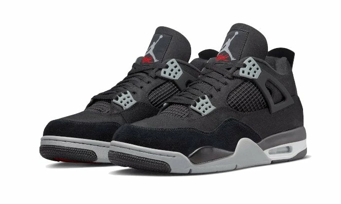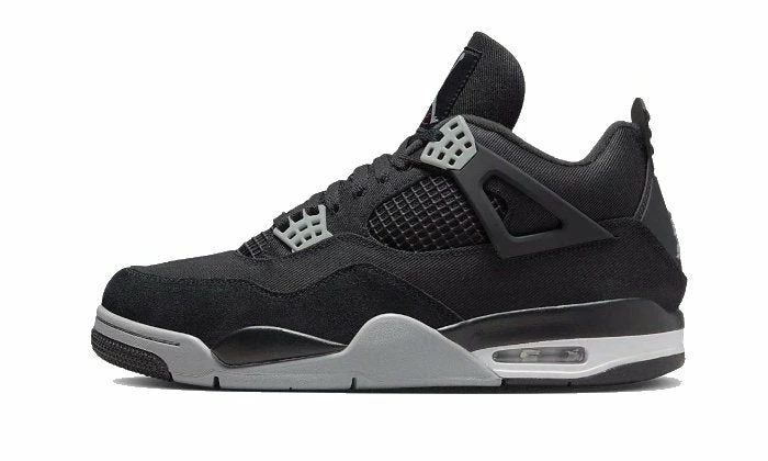 The Air Jordan 4 Black Canvas features a black canvas base with a tone-on-tone suede mudguard. Emblematic of this model, the TPU cage is well present in a black color, as the flaps. Grey eyelets, matching part of the midsole as well as the heel and tongue branding, bring contrast to this pair. A touch of white around the Air Sole unit gives the final touch to this novel iteration.