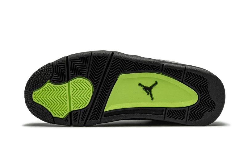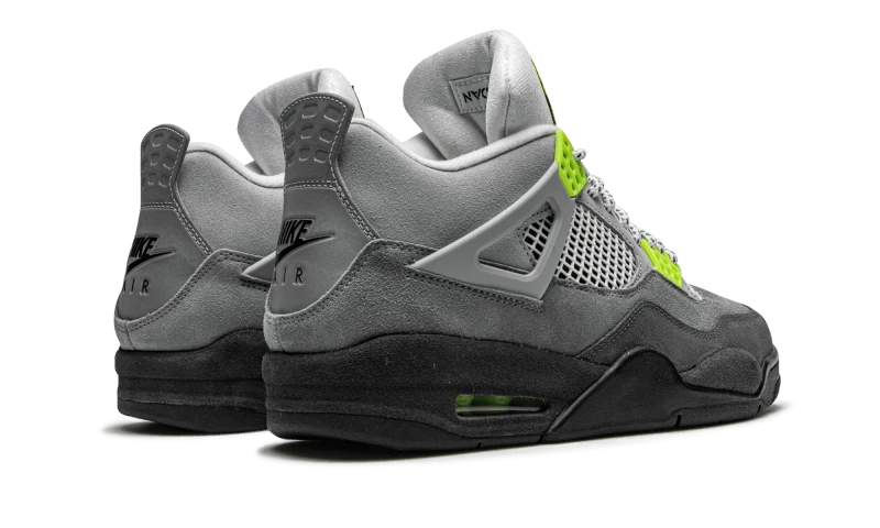 The Air Jordan 4 Neon Volt is adorned with a vamp made up of several shades of grey, with the famous yokes of the Air Jordan 4 The green/yellow fluorescents are present. It features the Jordan logo on the tab and the Nike Air logo in black on the heel.