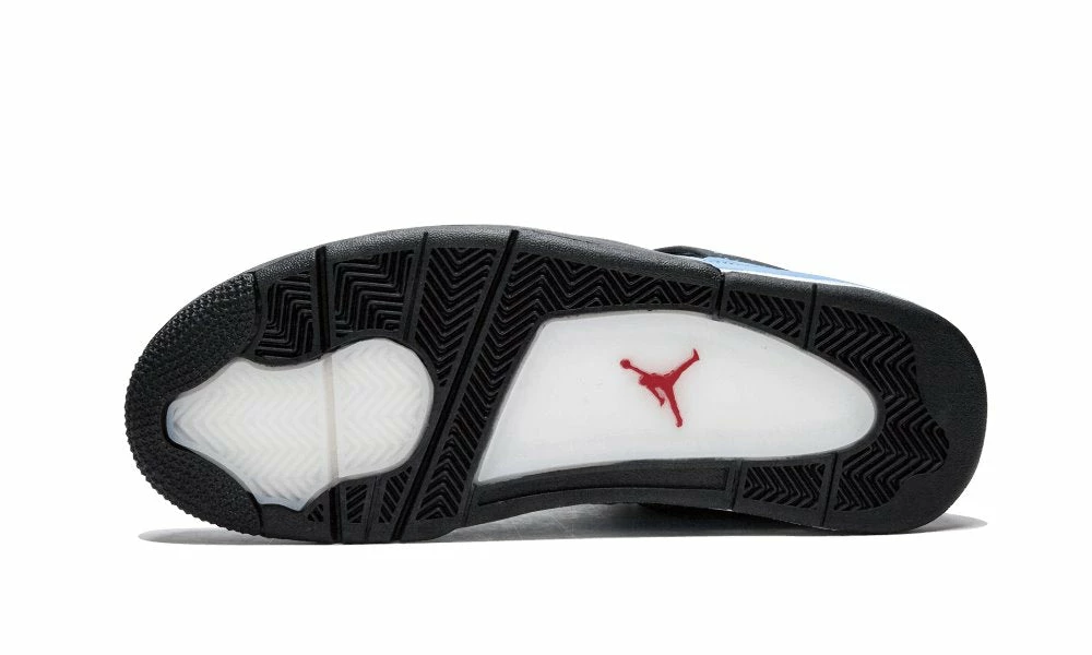 The black lace cage and heel feature a light blue speckled pattern. The brand Cactus Jack on the left heel in “Varsity Red” with a matching logo on the right Jumpman logo on the right.