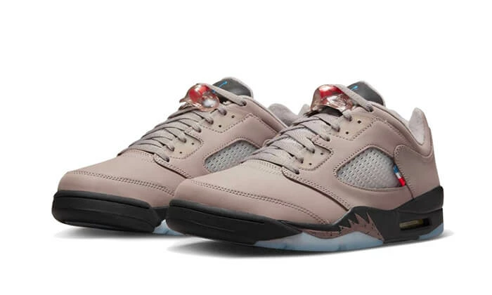 The Air Jordan 5 Retro Low PSG (2022) features a nubuck base in a taupe hue accompanied by tone-on-tone overlays. The translucent TPU cage is also present, matching part of the outsole. As for the details, there is a tricolor “Paname” tag on the quarter panel, matching the aglets, as well as a branded Jordan x Paris wax stamp on the heel.