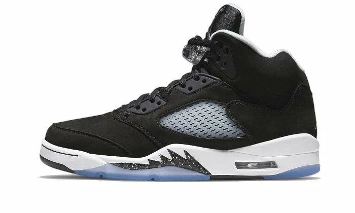 The Air Jordan 5 Retro Moonlight (Oreo) benefits from a The upper is made of black nubuck, a colour that is also found on the eyelets and laces. There is also a TPE reinforcement on the quarter panel, a translucent lace lock, as well as brandings on the tongue and heel. The design is finished off with a white sole, black speckle effect and an icy outsole.