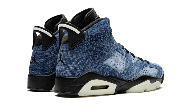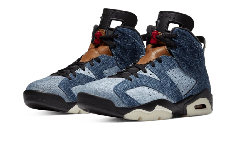 The Air Jordan 6 Retro Washed Denim features a base made up of alternating denim inserts in three colours. There is a brown leather patch covering part of the laces with a perforated tongue, a Jumpman heel and black laces. The shoe is finished off with a black and white sole with an AIR unit.