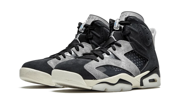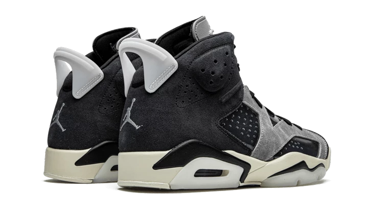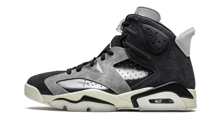 The Air Jordan 6 Tech Chrome features a black and grey suede upper. There are several elements such as grey inserts and translucent TPU on the midsole and heel tab. Classic branding elements are present with the metallic grey Jumpman logo on the tongue and heel. A white midsole completes the design!